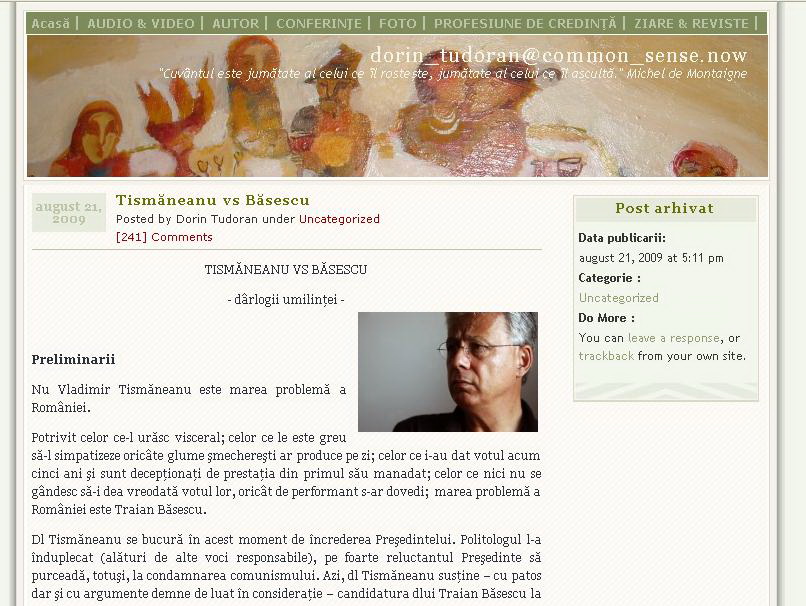 Incep cu esentialul. Cele ce urmeaza nu au drept scop declansarea unei polemici in sensul semantic denaturat dar comun azi din pacate in societatea romaneasca, adica a unei ‘incaierari’ care sa faca deliciul amatorilor unor asemenea ‘spectacole’. Pentru mine ‘polemica’ pastreaza prin educatie sensul dialogului antic. Decizia de a interveni public de asta data are la baza trei motive pe care le consider demne de acest efort. Primul are drept scop clarificarea sub aspectul acuratetei de ordin faptic la modul definitiv a afirmatiilor incorecte in raport cu realitatea pe care le-ati facut initial in articolul ‘Bobinacarul si energumenii’ publicat in Jurnalul National in urma cu trei ani dar pe care iata ca le repostati acum in 21 August 2009 ca pe un adevar indubitabil. Atunci, din motive pe care le voi explica mai tirziu am preferat sa nu va dau o replica corectiva cu speranta ca eroarea comisa a fost un simplu derapaj impus de circumstantele scrierii unui “material de serviciu” si dictat de obligatiile apartenentei la grupul de interese ce-l sprijineau neconditionat pe Vladimir Tismaneanu.