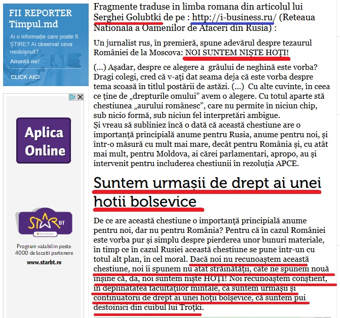 Mi se pare incredibil ca un rus, fie el și jurnalist, să aibă bunul simț și să recunoască public faptul că înaintașii lui au fost niște hoți, de care se desolidarizează în mod public și de care îi este rușine. Mi se pare greu de crezut că un rus poate gandi rațional și se poate exprima, iată, coerent, cu privire la Tezaurul României predat Moscovei în Primul Război Mondial, în două tranșe (decembrie 1916 și iulie 1917), Tezaur pe care apoi sovieticii, care au preluat puterea la Kremlin, au refuzat să-l mai înapoieze României, fiind și astăzi un motiv de dispută deschisă între România și dușmanul ei de la Răsărit, Rusia. Sunt șocat de ceea ce am citit într-un cotidian din Moldova, pentru că n-am crezut că și rușii sunt oameni, la fel ca noi, românii.