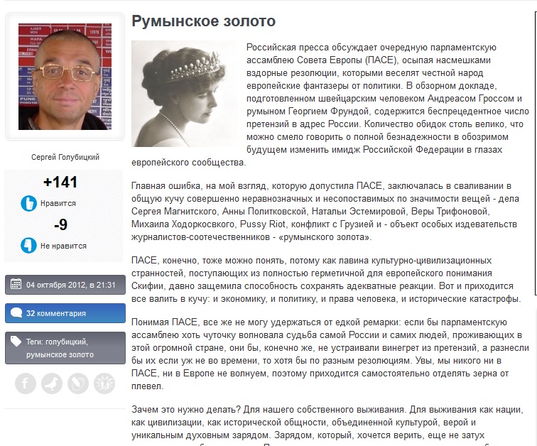 Iată că azi, un nou jurnalist, de vârsta mea, are curajul să spună că Rusia a furat de la români, că este o nație de hoți, ceea ce, pentru el este o mare rușine. Te respect pentru asta, Serghei Mihailovici Golubițki, deși n-am crezut că voi ajunge să spun vreodată că respect vreun rus în viață!