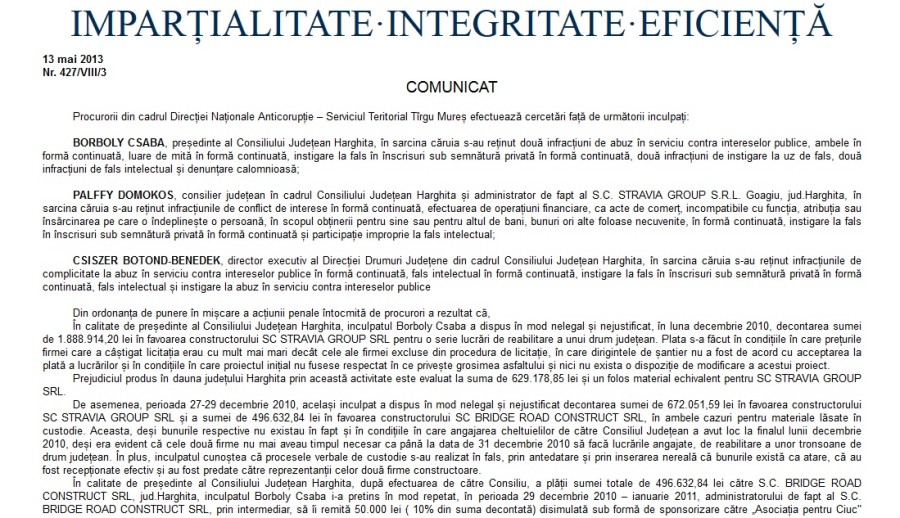 ”inculpatul Borboly Csaba a dispus în mod nelegal și nejustificat, în luna decembrie 2010, decontarea sumei de 1.888.914,20 lei în favoarea constructorului SC STRAVIA GROUP SRL pentru o serie lucrări de reabilitare a unui drum județean. Plata s-a făcut în condițiile în care prețurile firmei care a câștigat licitația erau cu mult mai mari decât cele ale firmei excluse din procedura de licitație, în care dirigintele de șantier nu a fost de acord cu acceptarea la plată a lucrărilor și în condițiile în care proiectul inițial nu fusese respectat în ce privește grosimea asfaltului și nici nu exista o dispoziție de modificare a acestui proiect. Prejudiciul produs în dauna județului Harghita prin această activitate este evaluat la suma de 629.178,85 lei și un folos material echivalent pentru SC STRAVIA GROUP SRL”.
