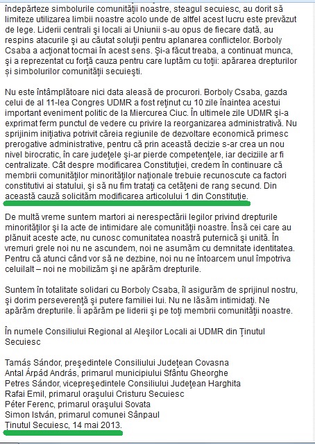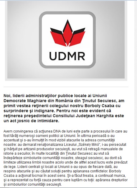”Noi, liderii administraţiilor publice locale ai Uniunii Democrate Maghiare din România din Ţinutul Secuiesc, am primit vestea reţinerii colegului nostru Borboly Csaba cu surprindere şi indignare. Pentru noi este evident că reţinerea preşedintelui Consiliului Judeţean Harghita este un act josnic de intimidare. Avem convingerea că acţiunea DNA de luni este parte a procesului în care au fost târâţi numeroşi oameni politici ai Uniunii. În ultima perioadă s-au accentuat şi s-au înmulţit în mod vizibil atacurile la adresa comunităţii noastre: au demarat renaţionalizarea Liceului „Székely Mikó”, i-au persecutat şi hârţuit pe artizanii produselor secuieşti, au vrut să retragă manualele de istorie a secuilor, în multe localităţi din Ţinutul Secuiesc au vrut să îndepărteze simbolurile comunităţii noastre, steagul secuiesc, au dorit să limiteze utilizarea limbii noastre acolo unde de altfel acest lucru este prevăzut de lege. Liderii centrali şi locali ai Uniunii s-au opus de fiecare dată, au respins atacurile şi au căutat soluţii pentru a