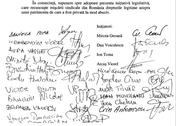 Insa nimeni n-a vrut sa dea informatia ca, in urma cu doua saptamani, Guvernul Romaniei s-a prezentat la Parlament, la Comisia de Industrii si Servicii a Camerei Deputatilor, pentru a cere respingerea proiectului de lege privind retrocedarea patrimoniului sindical confiscat de comunisti si ulterior de cei care au dat lovitura de stat in decembrie ’89.