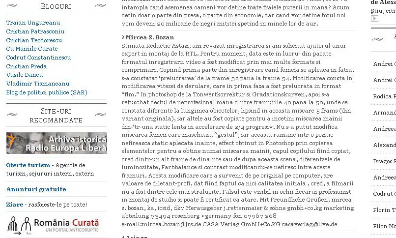 Un confrate din Germania, fostul deţinut politic Mircea S Bozan, a cerut părerea unui expert de la RTL cu privire la imaginile prezentate de vidanjele media ale lui Sorin Vîntu. Interesant este faptul că, după finalizarea oficială a acestei expertize, vidanjele media ale lui Vîntu şi Voiculescu (Gardianul,  Realitatea TV  şi Antena3) vor fi puse la index, în cazul în care nu vor fi închise, în mass media internaţionale.”Televiziunile care „au scos” acest film precum si publicatiile care l-au promovat, vor fi amintite ca rusini ale zonei media din Tarile fostului bloc sovietic. Dezbaterea va cere acordarea unui cartonas rosu pentru manipularea informatiei unor televiziuni romanesti, suspectate in ultimile luni de actiuni de santaj si manipulare si excluderea acestora din asociatiile europene”afirmă Mircea Bozan.