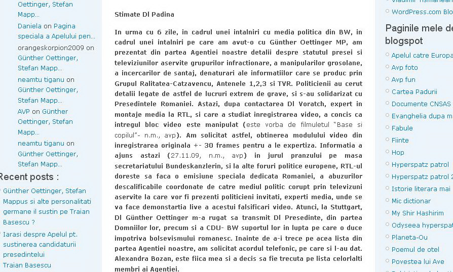 In urma cu 6 zile, in cadrul unei intalniri cu media politica din BW, in cadrul unei intalniri pe care am avut-o cu Günther Oettinger MP, am prezentat din partea Agentiei noastre detalii despre statutul presei si televiziunilor aservite grupurilor infractionare, a manipularilor grosolane, a incercarilor de santaj, denaturari ale informatiilor care se produc prin Grupul Ralitatea-Catzavencu, Antenele 1,2,3 si TVR. Politicienii au cerut detalii legate de astfel de lucruri extrem de grave, si s-au solidarizat cu Presedintele Romaniei. Astazi, dupa contactarea Dl Voratch, expert in montaje media la RTL, si care a studiat inregistrarea video, a concis ca intregul bloc video este manipulat (este vorba de filmuletul “Base si copilul”- n.m., avp). Am solicitat astfel, obtinerea modulului video din inregistrarea originala +- 30 frames pentru a le expertiza. Informatia a ajuns astazi (27.11.09, n.m., avp) in jurul pranzului pe masa secretariatului Bundeskanzlerin, si la alte foruri politice europene, RTL-ul doreste sa faca o emisiune speciala dedicata Romaniei, a abuzurilor descalificabile coordonate de catre mediul politic corupt prin televizuni aservite la care vor fi prezenti politicieni invitati, experti media, unde se va face demonstartia live a acestui falsificari video. Atunci, la Stuttgart, Dl Günther Oettinger m-a rugat sa transmit Dl Presedinte, din partea Domniilor lor, precum si a CDU- BW suportul lor in lupta pe care o duce impotriva bolsevismului romanesc. Inainte de a-i trece pe acea lista din partea Agentiei noastre, am solicitat acordul telefonic, pe care si l-au dat. Alexandra Bozan, este fiica mea si a decis sa fie trecuta pe lista celorlalti membri ai Agentiei.