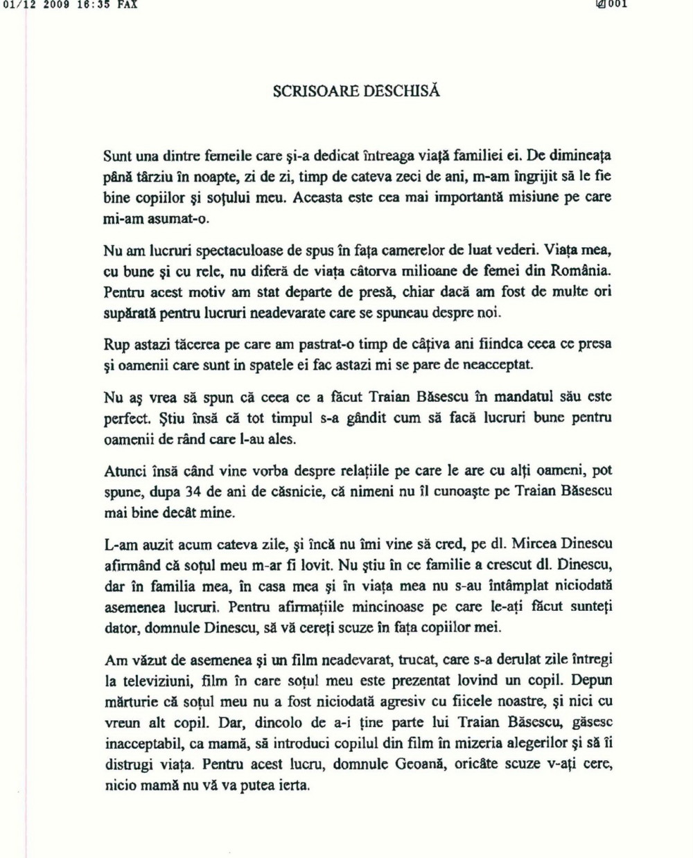 Soţia preşedintelui Traian Băsescu a adresat pe 30 noiembrie, opiniei publice, o scrisoare deschisă în care spune câteva lucruri de bun simţ despre soţul său, dar şi despre atacurile mizerabile lansate de politicienii sau derbedeii aflaţi în slujba lor.