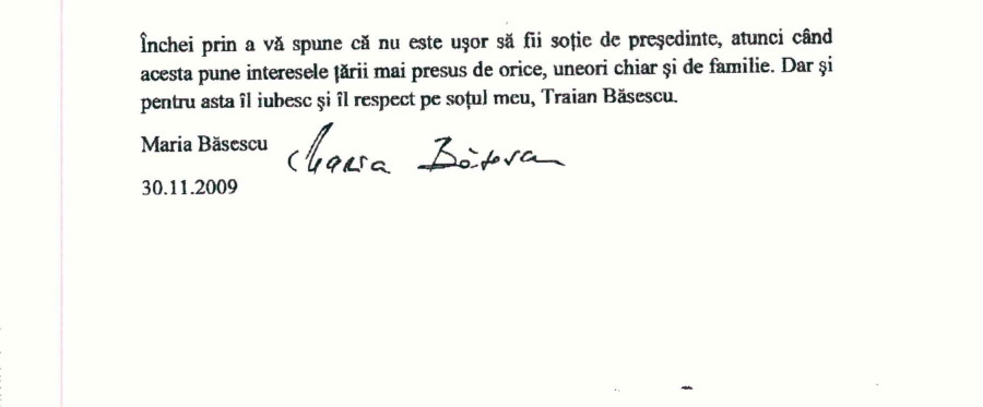 Inchei prin a va spune ca nu este usor sa fii sotie de presedinte, atunci cand acesta pune interesele tarii mai presus de orice, uneori chiar si de familie. Dar si pentru asta il iubesc si il respect pe sotul meu, Traian Basescu.