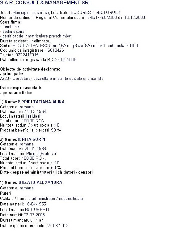Ca să-şi mişte cum trebuie banii, mungioaica şi-a înfiinţat şi o căpuşă pentru asociaţie, un SRL cu acelaşi nume, adică S.A.R. Consult & Management SRL, firmă în care ea deţine 50% din capitalul social, iar Sorin Ioniţă (directorul economic al asociaţiei SAR şi fost administrator al firmei SAR, până în martie 2008) deţine şi el tot 50%. În martie 2008, când Sorin Ioniţă a predat ştafeta de administrator al firmei către Alexandra Buzatu, mungioaica şi-a introdus în obiectul de activitate al SRL-ului posibilitatea de a desfăşura activităţi comerciale în străinătate, că doar acolo sunt banii şi fondurile structurale. („Activitatile societatii comerciale sau parte din ele se pot desfasura in strainatate, in favoarea persoanelor fizice sau juridice romane si/sau straine, iar incasarile de orice fel se pot face in lei si/sau valuta„- a adăugat academicianca de asociaţie).