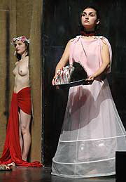 „Toate personajele masculine gravitează în jurul unicului personaj feminin, o prostituată (foto dreapta) prezentată drept „preoteasa zeiţei Artemis” şi asimilată, în subtext, cu Maria Magdalena (cu care Povestitorul-Iisus întreţine o perversă relaţie erotică: „Ai simţit natura divină din mădularul lui dumnezeiesc?”, întreabă sofistul; iar femeia răspunde: „Dimpotrivă… Atingerea lui e aproape imaterială. E un amant cu totul incapabil, dar un om fascinant…”). În scena spălării cu lacrimi a picioarelor lui Iisus, prefăcută de regizor într-un abominabil show erotic, Maria Magdalena începe de la tălpi şi termină între coapsele acestuia…