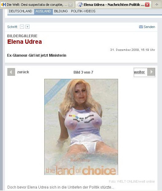 Cum astfel de rebuturi profesionale (cand scrii după ureche nu poţi fi decât un rebut!) sunt peste tot, nu e de mirare că declaraţiile aberante ale mungioaicei au fost preluate şi amplificate în publicaţii deservite precum EUobserver, The Sunday Times, Die Welt sau agenţia UPI. În Die Welt, graţie misionarului dinţos, a apărut chiar şi un trucaj cu Elena Udrea (vezi foto dreapta), derbedeii de la această publicaţie nefiind mai prejos decât ciutacii noştri.