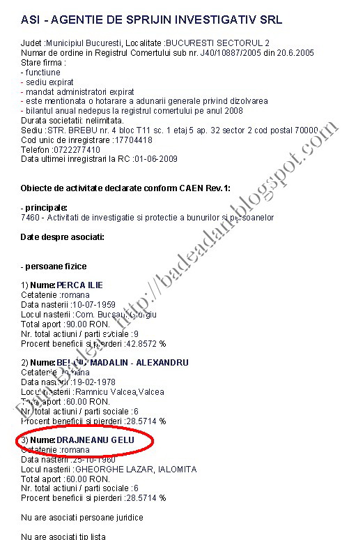 Astfel, el controlează firmele Dinamic Target Impex SRL, Laguna Door SRL (alături de Găluşcă Ionuţ Gheorghe) şi Laguna Trans SRL (alături de Andronescu Alexandru Vlad). Însuşi Gelu Drăjneanu, astăzi avocat la casa de avocatură a cumnatei sale, Carmen Mariana Drăjneanu, figurează la Recom ca acţionar al firmei ASI – Agenţie de Sprijin Investigativ SRL (foto stânga), alături de Perca Ilie şi Belciu Mădălin Alexandru. El a pătruns în firma celor doi în 2006, după ce aceştia i-au cedat nişte acţiuni. Interesant este faptul că în declaraţiile de avere ale lui Gelu Drăjneanu n-au figurat cele 6 părţi sociale(28, 57%) deţinute la ASI, fapt care ar fi trebuit să atragă autosesizarea Agenţiei Naţionale de Integritate.