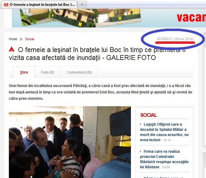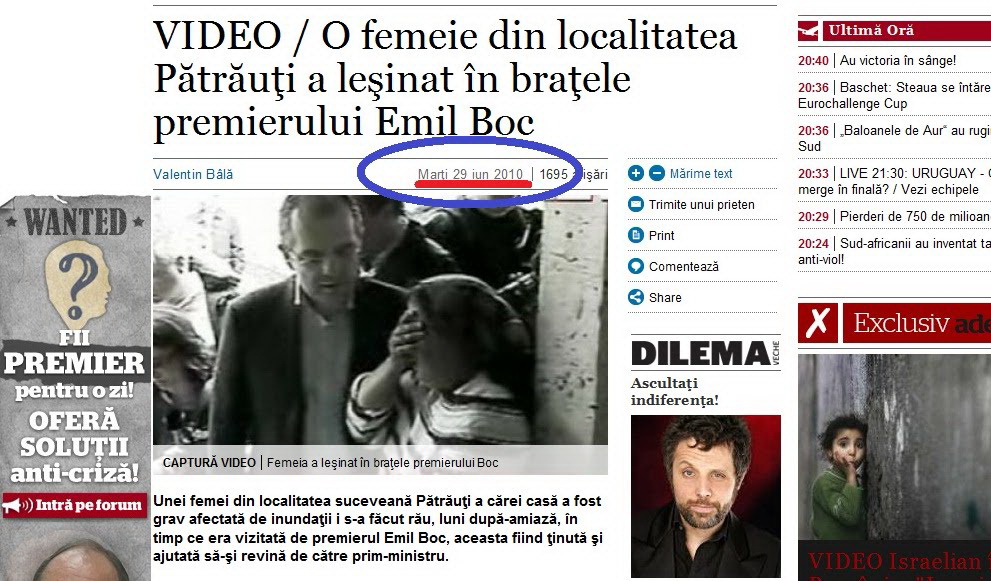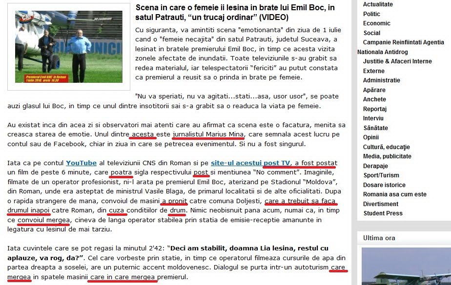 O nouă făcătură audio-video, de tipul celebrului trucaj „Băsescu loveşte un copil„, a fost lansată pe piaţa mass media. De această dată, nu mai e cu Băsescu, ci cu Boc, şi nu loveşte, ci salvează. De asemenea, făcătura nu mai e video, ci audio, iar televiziunea care o lansează nu e a lui Vîntu, ci din localitatea de baştină a lui Vîntu. Şi modul de lansare a diversiunii diferă: daca primul trucaj a fost plasat pe site-ul unei fiţuici pentru a fi preluat apoi de RTV, de această dată el a fost lansat pe site-ul unei televiziuni locale şi „descoperit” de o pseudo-agenţie de ştiri pentru a fi preluat apoi de fiţuici sau alte siteuri ale mogulilor. În final, pentru că nu se putea altfel, el a fost preluat şi de Realitatea lui Vîntu în emisiunea tonomatului Ursu. Ca operaţiunea să fie perfectă, în lanţul manipulării a intrat şi fiţuica online Cotidianul, cu rolul de intermediar între pseudo-agenţia de ştiri şi RTV. Astfel, pe post, sursa citată era Cotidianul şi nu un site despre care n-a auzit nimeni până acum.