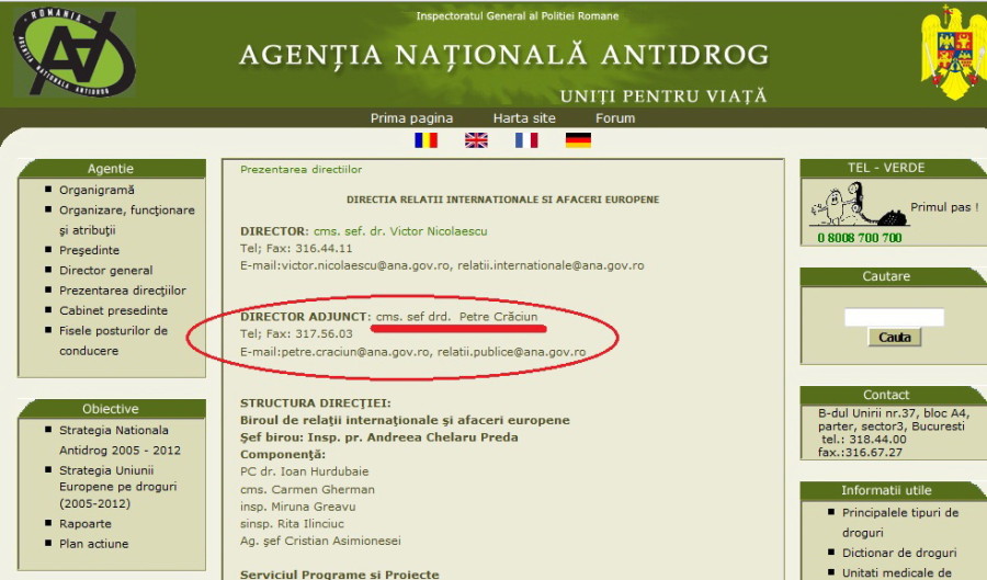 Pe de altă parte, individul are, printr-unul dintre fii lui, o firmă care se ocupă exact cu editare video, cu publicitate şi tot ce ţine de promovarea unor campanii mediatice. Este vorba despre societatea Optimal Media Communication SRL, care are sediul în Anastasie Panu nr. 21, adică exact unde este domiciliul familiei Crăciun. Firma lui a primit numeroase contracte de la MAI în perioada în care şeful Agenţiei Naţionale Antidrog (ANA) era Pavel Abraham. Asta deoarece el însuşi, adică acest Petre Crăciun, „profesorul de la jurnalism”, era directorul de comunicare al ANA. Mai precis, el a fost director adjunct al Direcţiei Relaţii Internaţionale şi Afaceri Europene din cadrul Agenţiei Naţionale Antidrog. Şi, cum altfel?, comisar şef!