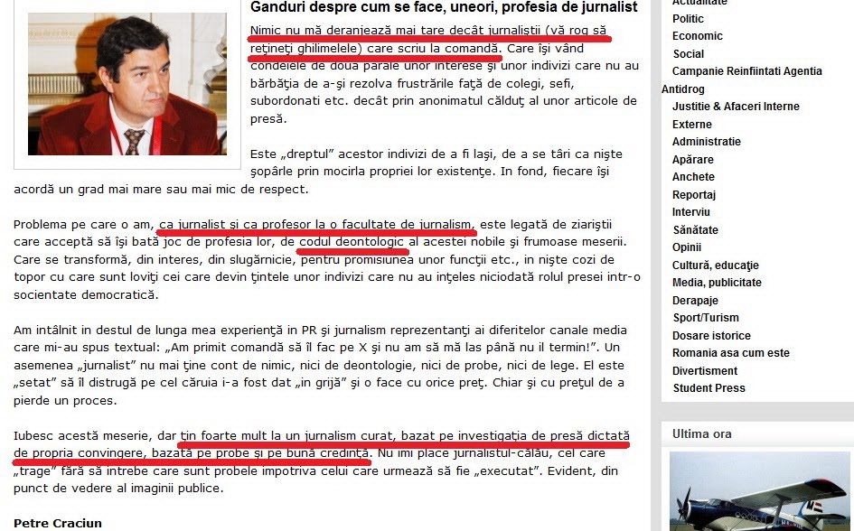 „Problema pe care o am, ca jurnalist şi ca profesor la o facultate de jurnalism, este legată de ziariştii care acceptă să îşi bată joc de profesia lor, de codul deontologic al acestei nobile şi frumoase meserii. Care se transformă, din interes, din slugărnicie, pentru promisiunea unor funcţii etc., in nişte cozi de topor cu care sunt loviţi cei care devin ţintele unor indivizi care nu au inţeles niciodată rolul presei intr-o socientate democratică„. (…) Iubesc acestămeserie, dar ţin foarte mult la un jurnalism curat, bazat pe investigaţia de presă dictată de propria convingere, bazată pe probe şi pe bună credinţă. Nu imi place jurnalistul-călău, cel care „trage” fără să intrebe care sunt probele impotriva celui care urmează să fie „executat” – zice deontologul Crăciun într-un editorial.Dacă observăm că el tocmai l-a „executat” pe Emil Boc fără să-l întrebe şi fără să se întrebe, cum îi place să scârţâie în „editorial”, „care sunt probele împotriva celui care urmează să fie executat„, nu putem decât să constatăm că individul este o „coadă de topor”, un „călău” (jurnalist-călău nu poate fi, că nu ştie să scrie corect). Este dreptul lui să fie aşa, sau, cum spune el în acelaşi „editorial”, „este „dreptul” acestor indivizi de a fi laşi, de a se târi ca nişte şopârle prin mocirla propriei lor existenţe„.