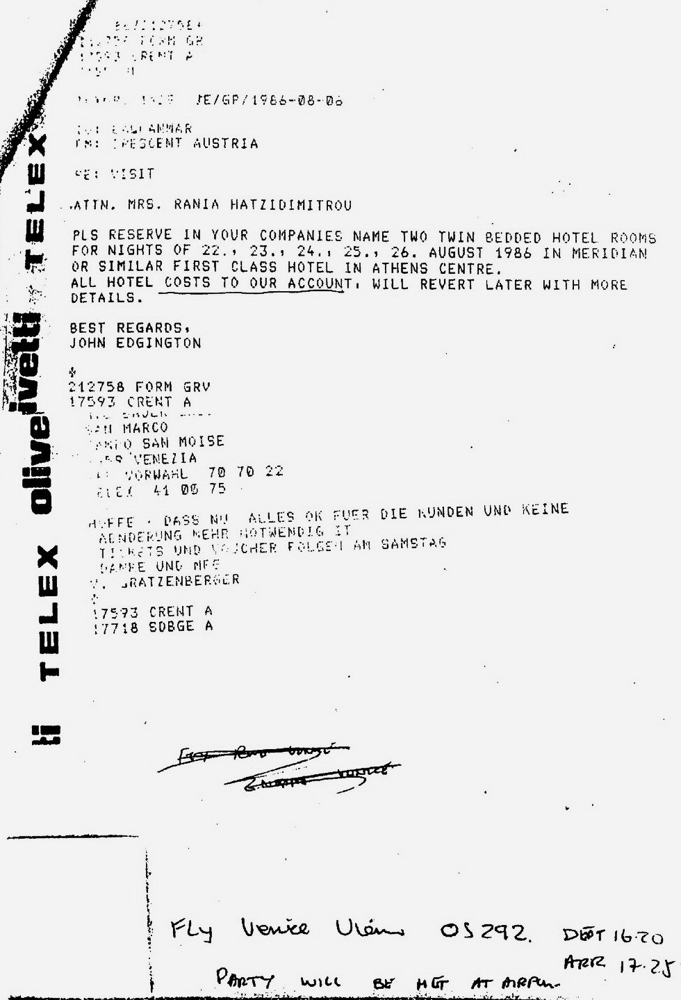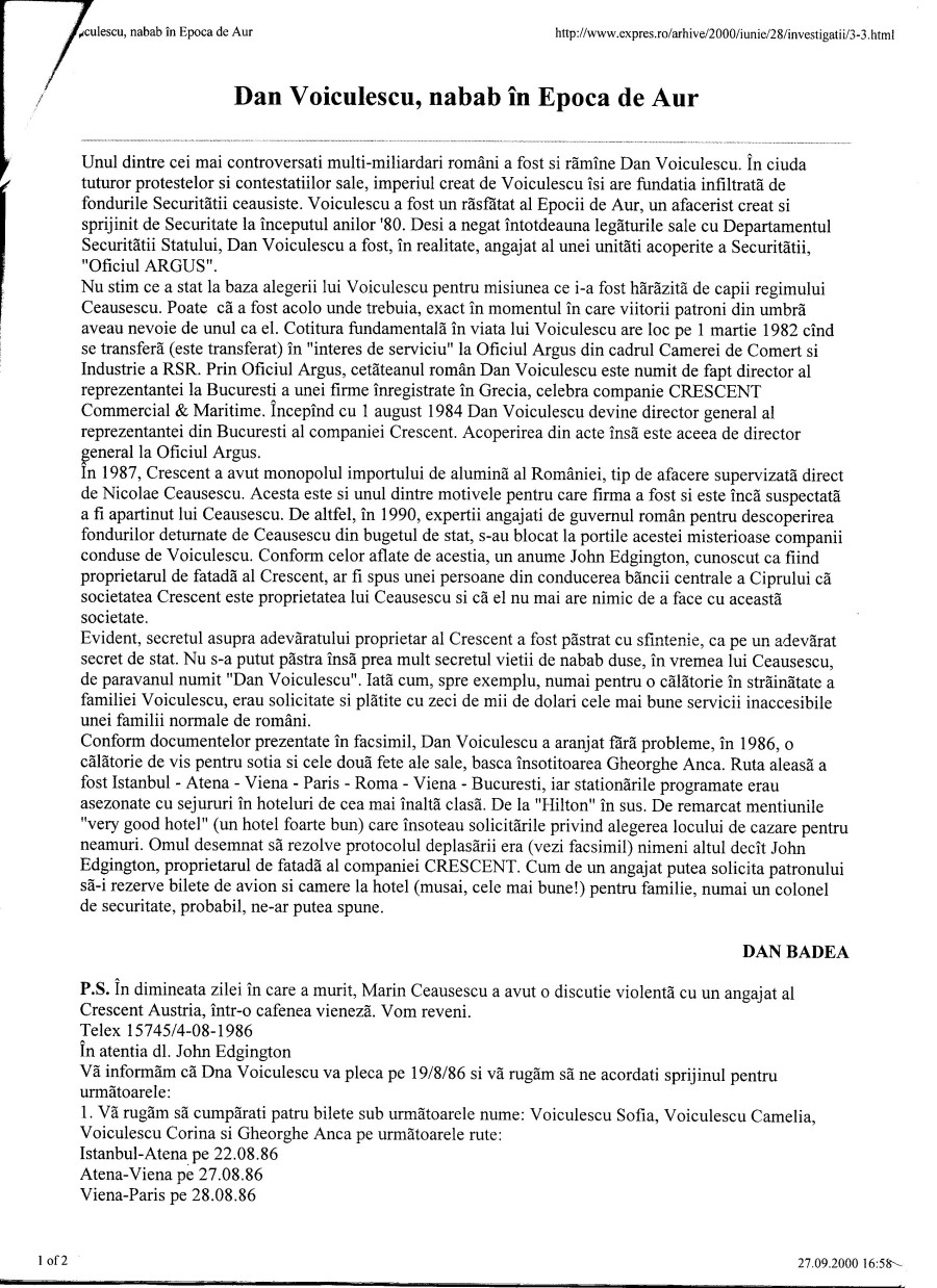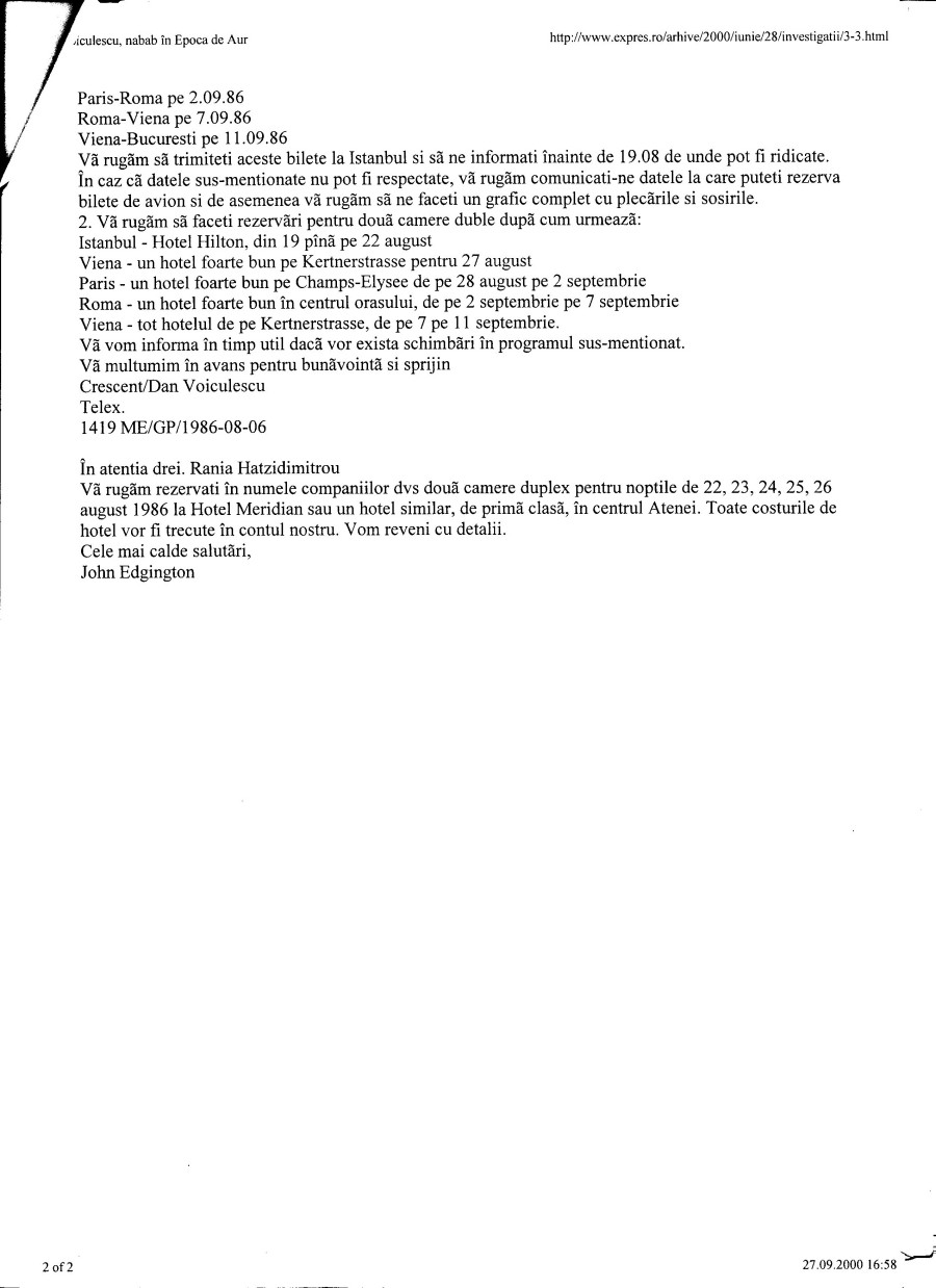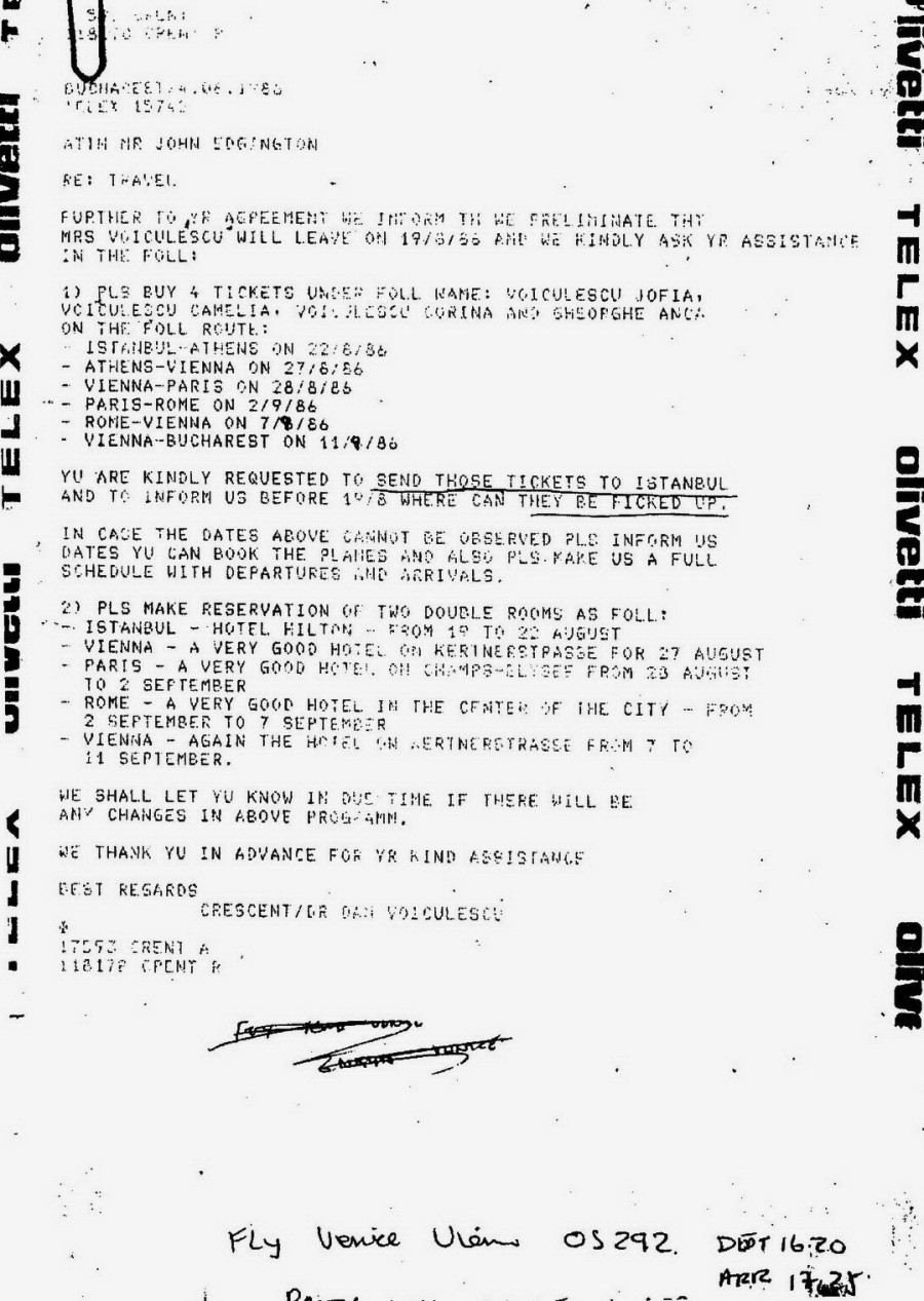 Documentele publicate erau nişte telexuri transmise de Voiculescu proprietarului de carton al Crescent, John Edgington, căruia îi cerea să rezerve, pe numele sotiei sale (Sofia), a fiicelor (Camelia şi Corina) şi a unei însoţitoare (Anca Gheorghe) bilete de avion şi camere de hotel în câteva capitale europene (Istanbul, Atena, Paris, Roma, Viena). Voiculescu îşi trimitea familia în vacanţă, prin Europa, şi voia să fie sigur că va avea cel mai frumos sejur. Iată documentele:
