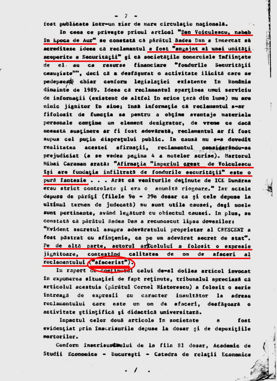Iată ce judecată de valoare a făcut, printre altele, „judecătoarea” lui Dan Voiculescu: „autorul articolului a folosit o expresie jignitoare, contestând calitatea de om de afaceri a reclamantului („afacerist”)„. Altfel spus, faptul că în loc de „om de afaceri”, i-am spus lui Dan Voiculescu „afacerist„, reprezintă, după mintea de bibilică a lui Pasăre, o jignire!