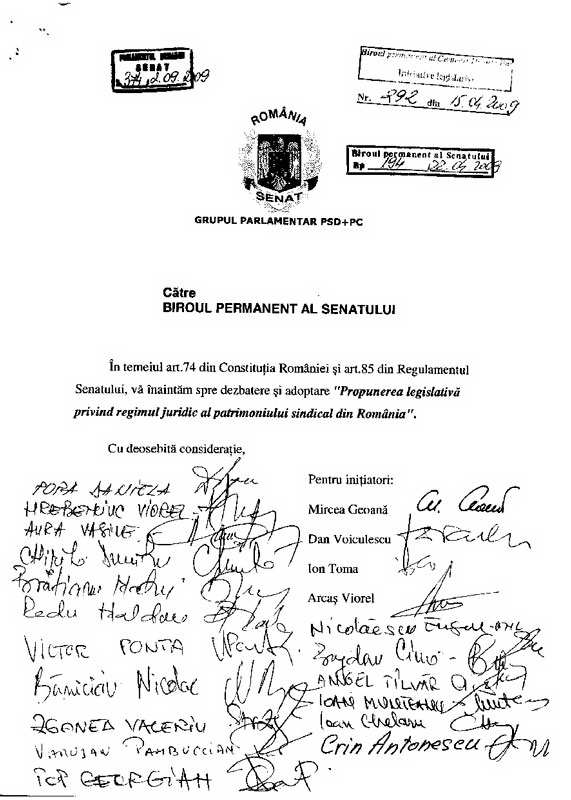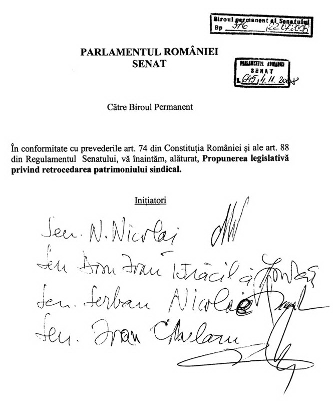 Cei patru senatori au înaintat Biroului Permanent al Senatului, în iulie 2008, o „propunere legislativă privind retrocedarea patrimoniului sindical“. Este vorba despre proiectul de lege 645/2008, care a fost clasat destul de repede, pe 22 decembrie acelaşi an. În document nu se specifica retrocedarea patrimoniului UGSR către sindicate, ci către un organism (persoană juridică) ce urma a fi înfiinţată, Uniunea Naţională pentru Preluarea Patrimoniului Sindical. La fel, nu se preciza concret în ce consta averea fostei UGSR. Câteva luni după clasare, propunerea legislativă este reluată, în exact aceeaşi formă, de doi senatori PNL: Puiu Haşotti şi Emilian Frâncu.