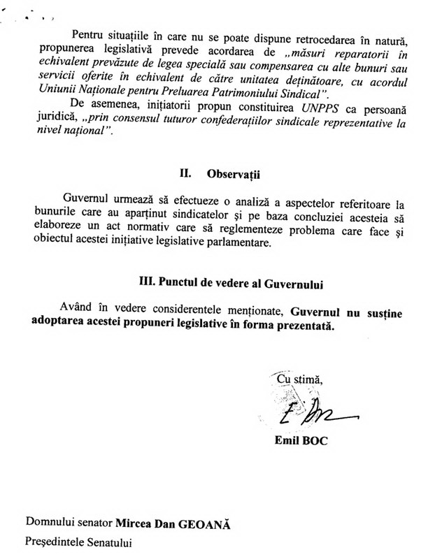 Ca un bonus electoral, până la retrocedare, parlamentarii PSD Viorel Hrebenciuc, Aurelia Vasile şi Dumitru Chiriţă au mai iniţiat un proiect de lege referitor la împropietărirea confederaţiilor sindicale cu sediile în care-şi desfăşoară activitatea. „Confederaţiile reprezentative la nivel naţional, semnatare ale contractului colectiv de muncă unic la nivel naţional pe anii 2007-2010, pot primi în folosinţă gratuită, pe perioada existenţei confederaţiei sindicale, imobile aflate în domeniul public sau privat al statului şi în administrarea regiilor autonome, prefecturilor, instituţiilor publice de nivel naţional, judeţean sau local şi a autorităţilor publice centrale şi/sau locale“ – se arată în articolul 1 al proiectului de lege. Pomana sindicală a primit şi de această dată refuzul guvernului Emil Boc, pe motiv de neconstituţionalitate. În aceste condiţii, cum să nu-ţi doreşti schimbarea lui Boc şi a guvernului care nu înţelege nevoile acute ale mafiei sindicale? Iată, aşadar, patru lovituri succesive aplicate de micuţul Boc unor bivoli uriaşi cum sunt liderii sindicali, liderii alianţei GRIVCO, dar şi golănasssului care a tâlhărit peste 300.000 de români în megaescrocheria FNI. Este explicabilă, aşadar, furia dezlănţuită a derbedeilor sindicali care nu pierd nicio ocazie să-şi arate „respectul“ faţă de guvern şi de preşedinţie.