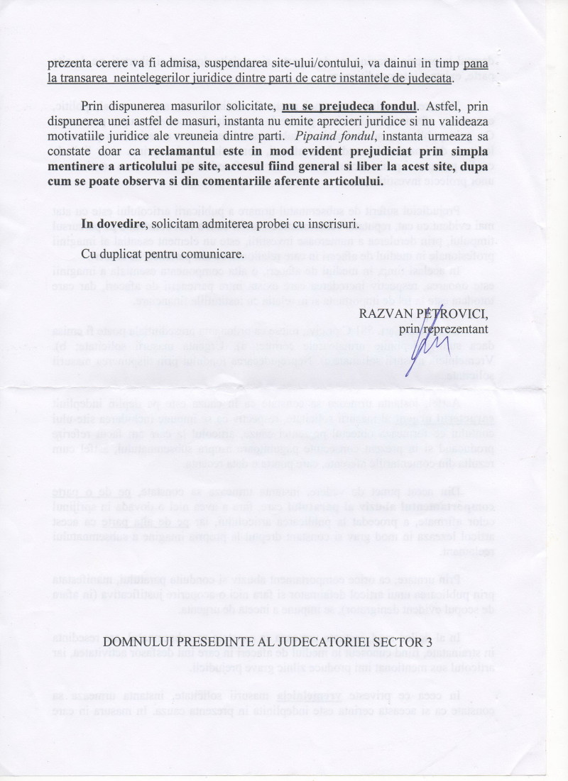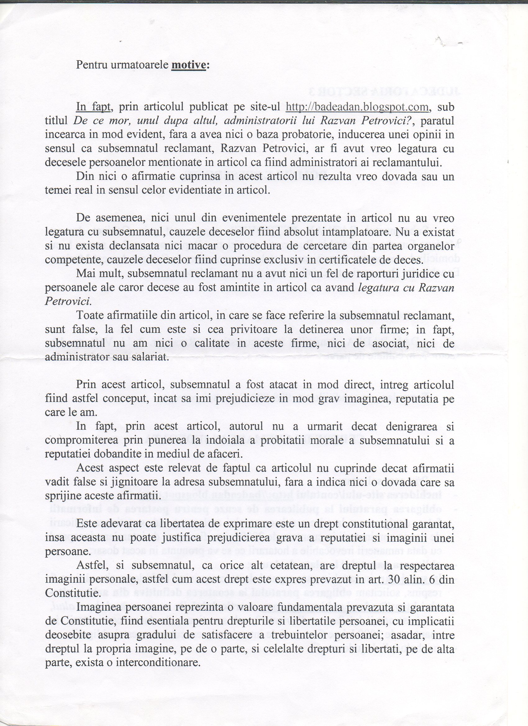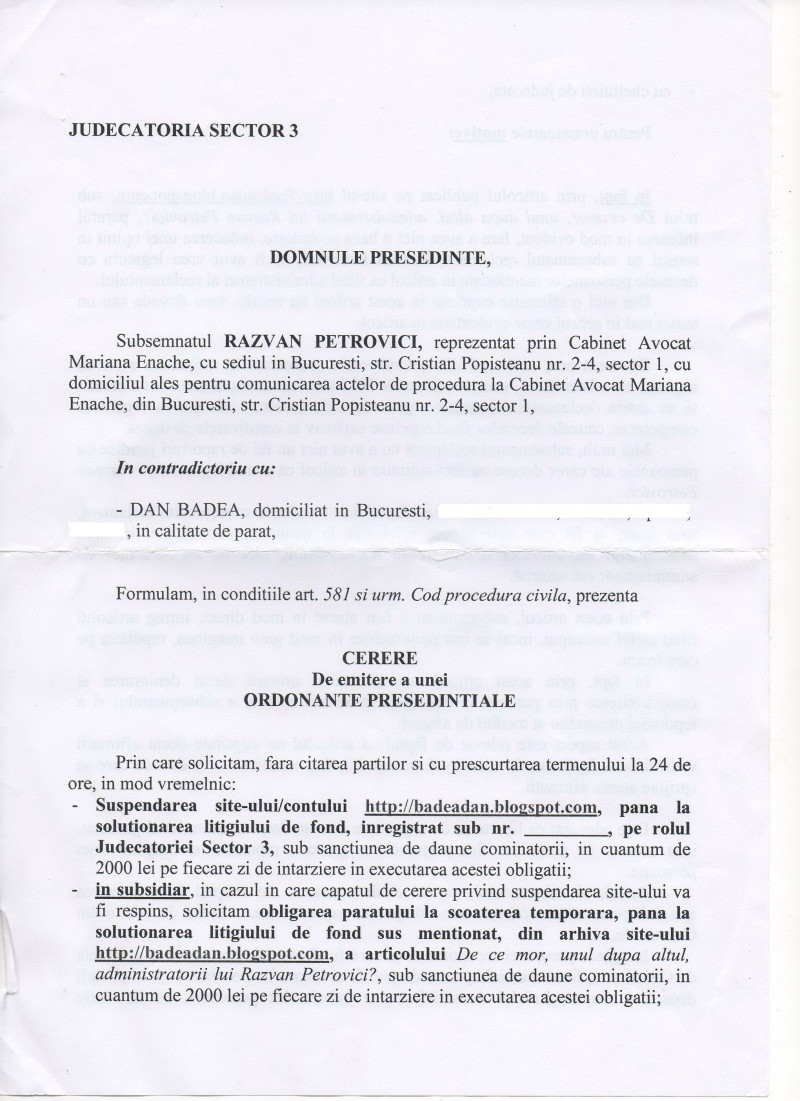 Dacă oricine te poate da în judecată şi-ţi poate închide gura până se va dovedi că spuneai adevărul, atunci trebuie să mergem la culcare. Pentru că tocmai asta mi se întâmplă mie. Petrovici m-a dat mai întâi în judecată cerând închiderea blogului, publicarea de scuze, plata unor daune etc., dar pentru că primul termen pentru judecată a fost stabilit la 10 martie, a intentat o nouă acţiune prin care cere, în regim de urgenţă (Ordonanţă preşedinţială) închiderea blogului până se va decide pe fond dacă cele afirmate de mine sunt reale sau inventate. Aşa se face că pe 12 ianuarie am avut primul termen la Judecătoria sector 3, dar pentru că nu am avut avocat am cerut amânare. Pe 9 februarie am amânat din nou, deoarece avocatul pe care-l găsisem a avut o altă urgenţă în ziua procesului, iar următorul termen s-a fixat pentru 23 martie.