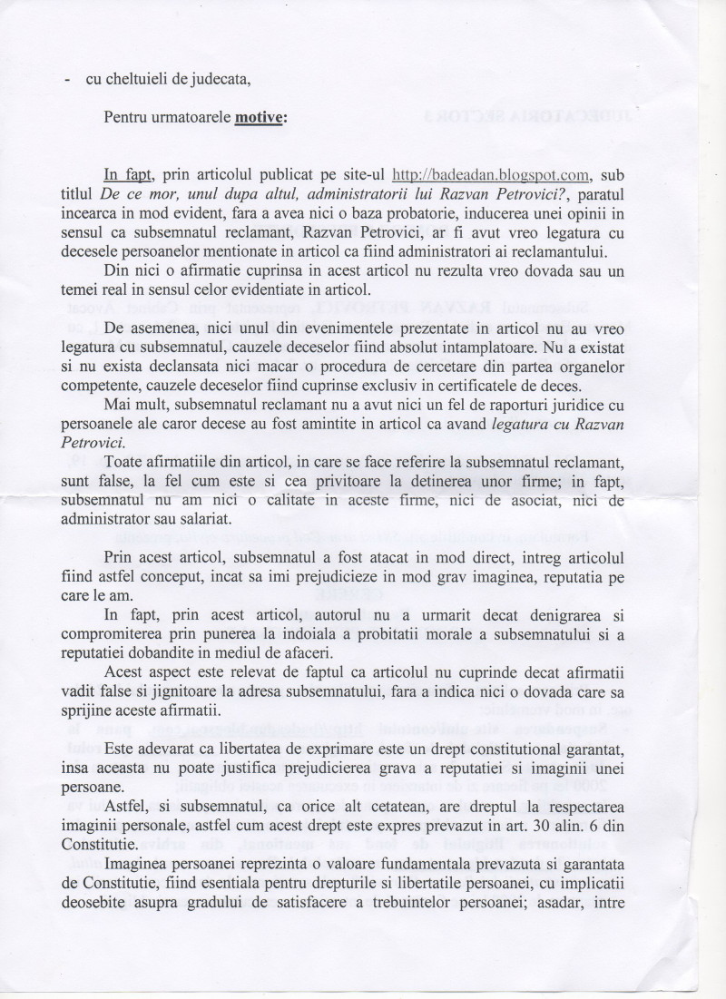 Ceea ce mi s-a părut la fel de îngrijorător ca solicitarea agresivă de închidere a acestui blog a fost faptul că Răzvan Petrovici mă consideră vinovat şi de comentariile care însoţesc materialul postat de mine. El a depus ca probă la dosar toate comentariile celor care şi-au permis să-şi spună părerea cu privire la cele scrise de mine. Printre ele sunt şi cele ale părinţilor lui Bogdan Stavre, cel care s-a sinucis în condiţii dubioase şi despre care părinţii săi afirmă că a fost ucis de mafia Univers’all. „Sunt convins ca fiul meu a fost omorat de capii mafiei de la Univers’All. Primul telefon pe care l-a primit a fost menit sa verifice daca e acasa, iar al doilea sa il scoata din casa pentru ca asasinii platiti sa poata pune mana pe el” – a declarat tatăl îndurerat al lui Bogdan Stavre, pentru un cotidian constănţean. La fel, printre comentatori sunt şi persoane din imediata apropiere a lui Petrovici, persoane care dezvăluie, pe răspunderea lor, amănunte extrem de interesante despre familia finului lui Virgil Măgureanu.