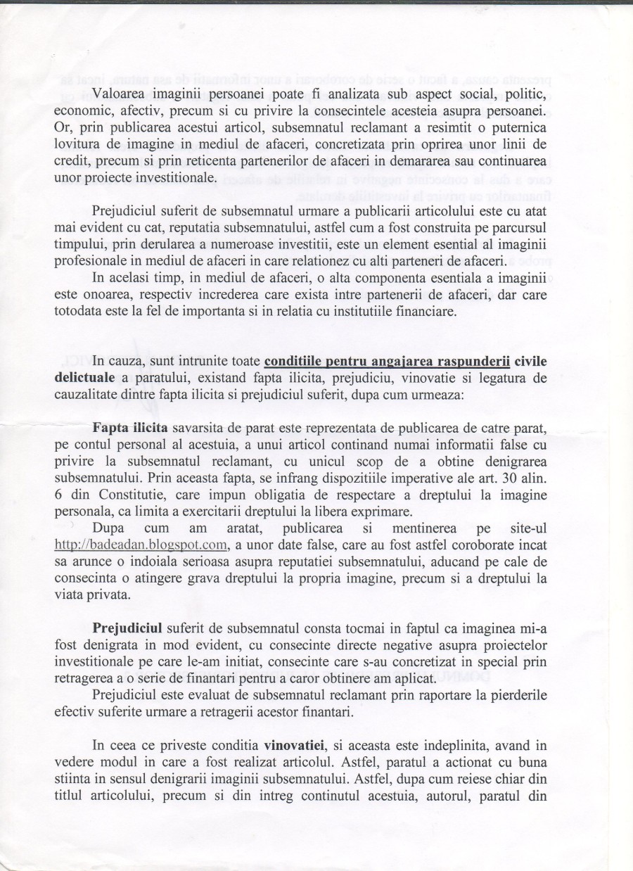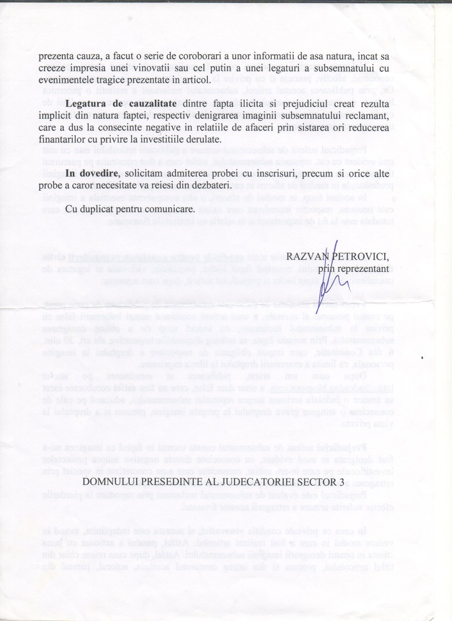 Iată şi conţinutul cererii de chemare în judecată, al cărei prim termen este 10 martie a.c: