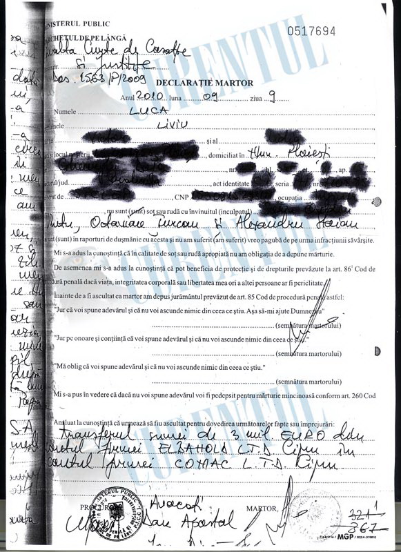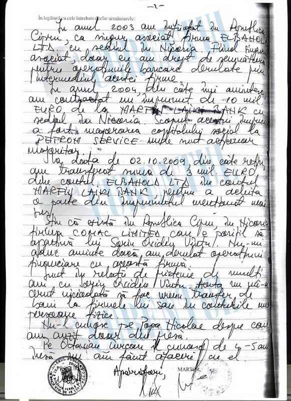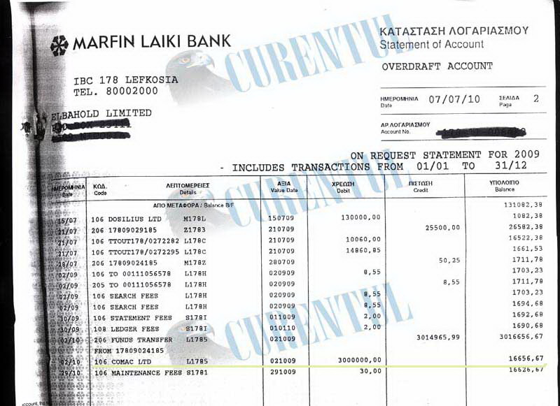 Am demontat deja, punct cu punct, această declaraţie, folosindu-ne chiar de documente existente la dosarul cauzei, coroborate cu altele pe care le-am publicat deja. Există un extras de cont al firmei Elbahold Ltd de la Banca Marfin Laiki Bank din Cipru, din perioada 01.01.2009-31.12.2009,