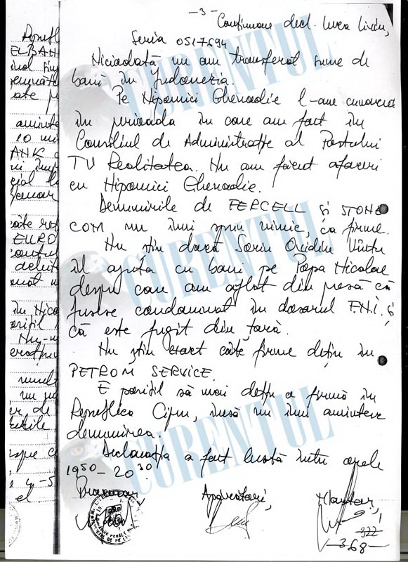 în care apare consemnat transferul sumei de trei milioane de euro în contul firmei Comac Ltd. În al doilea rând, Liviu Luca n-a fost şi nu este acţionar majoritar la Petromservice, în 2004 acţionarul majoritar fiind Asociaţia Salariaţilor din SNP Petrom. Mai mult, crezând probabil că autorităţilor române le este imposibil să obţină date despre operaţiunile sale financiare făcute prin banca cipriotă, Liviu Luca a afirmat că nu-şi aduce aminte dacă a derulat operaţiuni financiare cu acea firmă. Ca să-l ajutăm să-şi amintească, noi am publicat atunci, în facsimil, alături de extrasul de cont al firmei Elbahold Ltd, care consemna acea tranzacţie, un document intern al Petromservice din care rezulta că, începând cu octombrie 2003, conform hotărârii Adunării Generale Extraordinare a Acţionarilor, managementul societăţii din Ploieşti era asigurat chiar de către Comac Ltd. Pentru şi mai multă acurateţe, am mai publicat atunci inclusiv un document CNA care consemna faptul că firma Comac Ltd avea printre acţionari, în 2004, chiar societatea lui Liviu Luca, Elbahold Ltd. Luca a mai declarat în fals şi despre relaţia sa cu Nicolae Popa şi Octavian Ţurcan, co-inculpat în acelaşi dosar cu Sorin Vîntu. Despre Ţurcan a spus că îl cunoaşte, dar nu a făcut afaceri cu el, deşi conform unui document deţinut de noi Octavian Ţurcan este chiar cel care s-a ocupat de depunerea în banca cipriotă a specimenului unic de semnătură al lui Liviu Luca, pentru firma Elbahold Ltd . Pe de altă parte, despre Nicolae Popa a spus că nu-l cunoaşte şi că a auzit de el „doar din presă“. Cu 10 ani în urmă, în mai 2000, sindicatul condus de Liviu Luca, FSLI Petrom, a ridicat de la FNI 33 miliarde de lei până în mai 2000, adică de peste trei ori mai mult decât suma depusă. Nicolae Popa era atunci – aşa cum au declarat atât el, cât şi Sorin Vîntu – administratorul banilor de la FNI ai lui SOV, prietenul lui Luca. Popa deţinea, la acea dată, şi funcţia de director general al Gelsor, după ce fusese unul dintre administratorii SOV Invest. Minciunile lui Liviu Luca sunt, aşadar, atât de uşor de demontat încât mă întreb de ce n-a fost încă avansat de la gradul de martor la cel de complice la infracţiunea de favorizare a infractorului, iar singurul răspuns pe care îl găsesc este că judecătoarea Camelia Bogdan n-a intrat încă în carnea dosarului, împiedicată fiind de „rotulita genitală“ a lui SOV, vorba confratelui G. Roncea.
