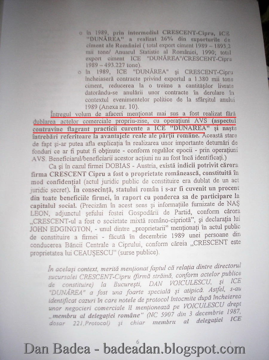 2. Al doilea argument este că, la puţin timp de la înfiinţare, Crescent devine partenerul de bază („principalul beneficiar”) al ICE Dunărea pentru operaţiuni de export ciment, uree, produse metalice şi aluminiu. Un raport realizat în anul 2000 de către doi procurori care au avut acces la dosarul ICE Dunărea din arhiva SIE, a consemnat date care confirmă importanţa deosebită pe care fostul DSS o acorda relaţiei cu Crescent, firmă pe care o trata ca şi când i-ar fi aparţinut. Asta deoarece toate operaţiunile derulate prin Crescent – Cipru (societate înfiinţată în 1984, de acelaşi Fouad Sanbar, al cărei director general a fost numit tot Dan Voiculescu – vezi detalii aici) au fost realizate „fără dublarea actelor comerciale propriu-zise cu operaţiuni AVS„, ceea ce contravenea flagrant practicii curente a ICE Dunărea.