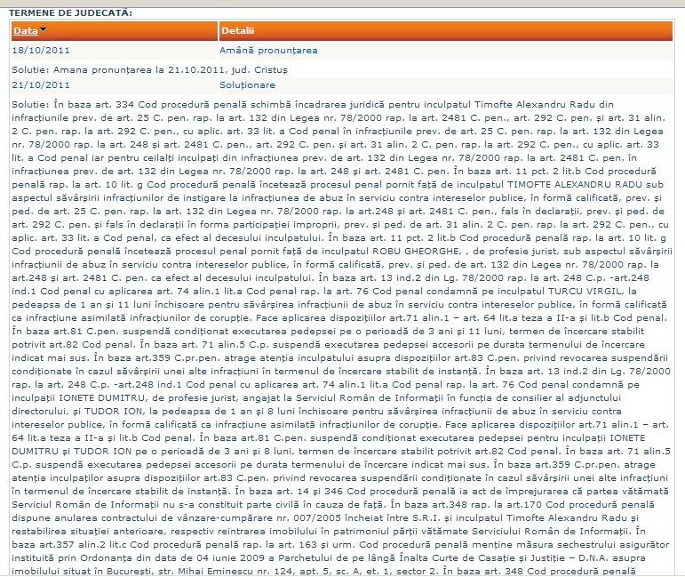 De asemenea, ”avantajul patrimonial” obținut de cei trei inculpați s-a ridicat, astfel, la aproximativ 1,9 milioane de euro. De menționat că maiorul Miu nu era adjunct al directorului SRI dar, conform dezvăluirilor de presă, el era atunci logodnicul fiicei șefului SRI, deci, în modul sau valoare absolută, tot un fel de adjunct. După aproape trei ani de judecată, instanța Înaltei Curți de Casație a pronunțat, zilele trecute, sentința în acest dosar, condamnându-i pe cei doi foși adjuncți ai lui Timofte, Ionel Marin și Dumitru Zamfir, dar și pe maiorul Cătălin Miu, la câte un an închisoare cu suspendare pentru fals în declarații.