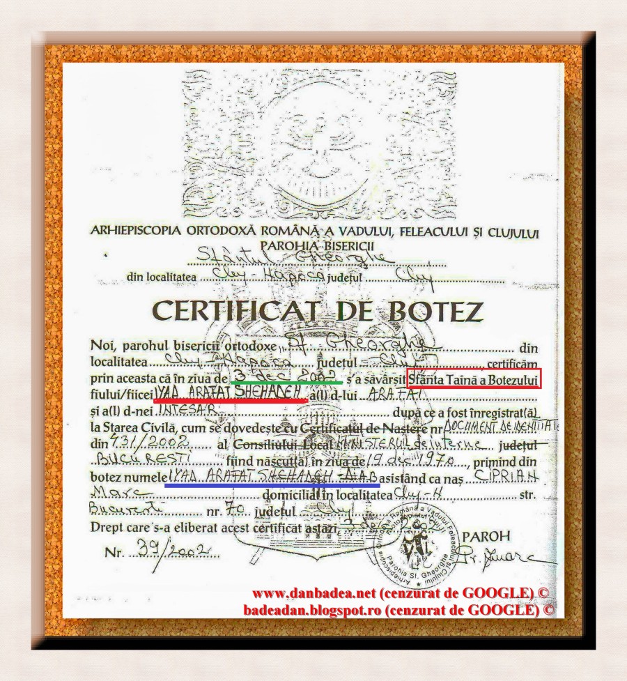 Iată mai jos, în facsimil, certificatul său de botez, semnat de parohul bisericii ortodoxe ”Sf. Gheorghe” din Cluj Napoca, pe 3 decembrie 2002. Așadar, avem de-a face cu un musulman creștin-ortodox, o struțo-cămilă imposibil de imaginat pentru un bun creștin, sau un bun musulman. Cazul ne-a atras atenția, mai ales după ce l-am identificat pe Iyad (nume parcă predestinat!), în mai multe rânduri, printre musulmanii aflați la rugăciune în moscheea clujeană de pe strada Păstorului și i-am ascultat și declarațiile publice în care proslăvea religia musulmană.