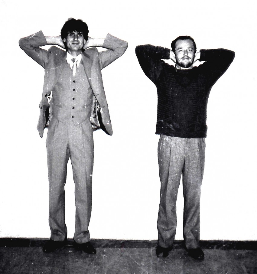 Cu Francisc Varga, coleg si prieten, în poziția prizonierului ”cu arma în spate”. Într-o zi am mers în poziția asta, cu mâinile la ceafă, de la Universitate la Piața Romană…