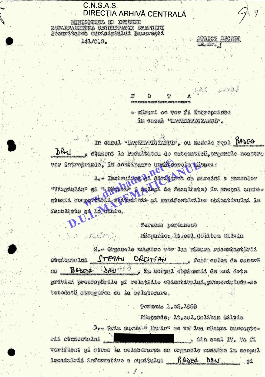 Ulterior însă, am descoperit un alt plan de măsuri, o NOTĂ ce conținea ”măsuri ce vor fi întreprinse în cazul ”MATEMATICIANUL””, document în care a fost consemnată inclusiv încercarea de recrutare a mea, dar și dezacordul ofițerului (”NU AȘA”) față de metoda punerii în discuția organizației UTC în cadrul cărei să fie înfierată fapta comisă de mine…Majoritatea măsurilor erau în sarcina securistei Universității, lt.col COLIBAN Silvia.