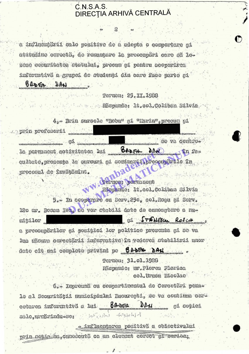 La fel, prin intermediul unei alte surse, ”MARIN”, scrie lt.col Silvia Coliban la punctul 3, , ”se va lua măsura cunoașterii studentului (cenzurat), din anul IV. Va fi verificat și atras la colaborare în scopul încadrării informative a numitului BADEA DAN și a influențării sale pozitive de a adopta o comportare și atitudine corectă, de renunțare la preocupări care să lezeze securitatea statului, precum și pentru acoperirea informativă a grupei de studenți din care face parte și BADEA DAN”