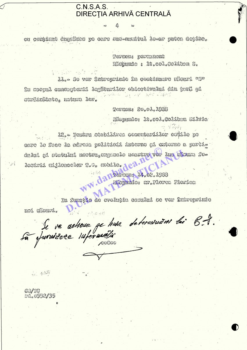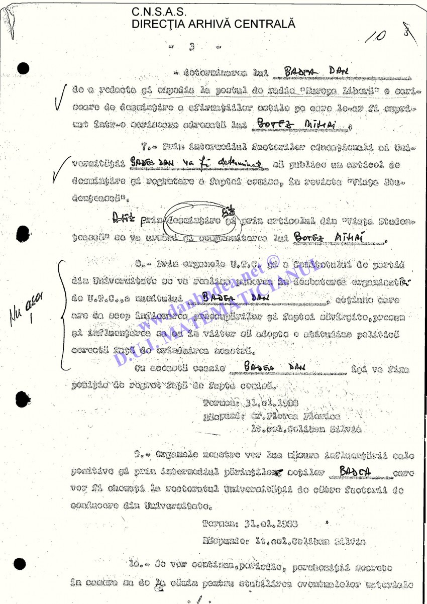 Prin sursele BOBU și MARIN, continuă Coliban, dar și prin profesorii A,B,C,D (cenzurat, dar nu mă pot abține să nu-l divulg pe ”D”, care era Dincă George – prorectorul Universității și PERSOANĂ DE ÎNCREDERE pentru Securitate, cum am arătat cu documente în episodul II) ”se va controla permanent activitatea lui BADEA DAN în facultate, prezența la cursuri și seminarii” etc.