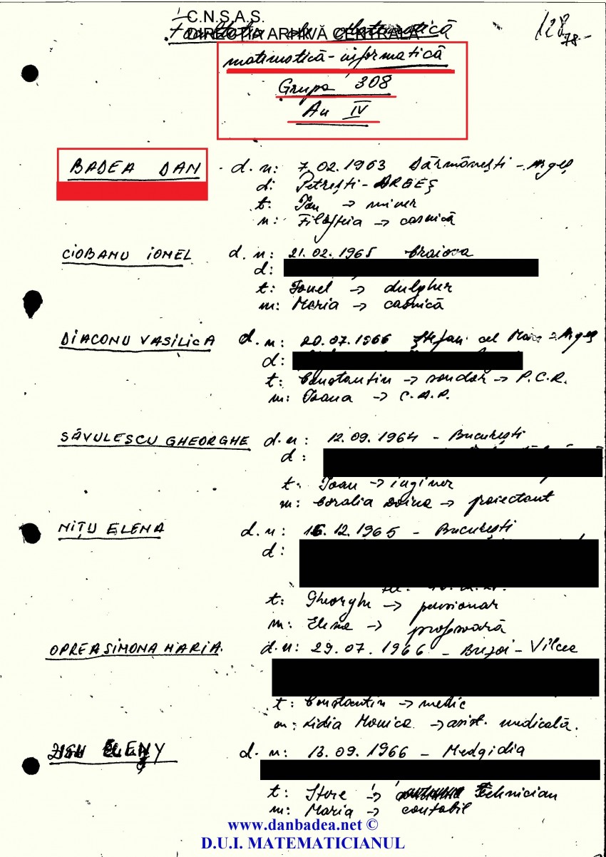 Cum voi arăta mai jos, securiștii au greșit grupa din care făceam parte, recrutând un informator din grupa de matematică-informatică din care făcea parte, de fapt, soția mea.